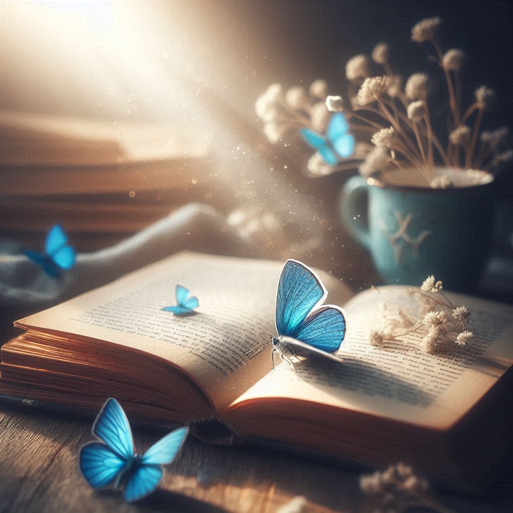 Blue butterflies rest on an open book with flowers and a cup in the background.