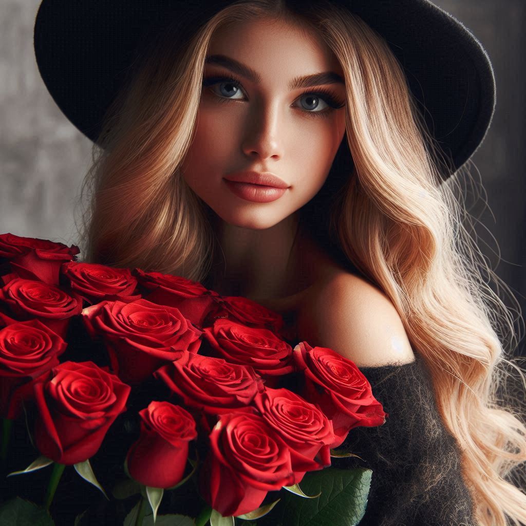 beautiful, beauty, black, blonde, bouquet, fashion, floral, flowers, gift, hair, hat, love, model, portrait, red, romance, romantic, roses, style, woman