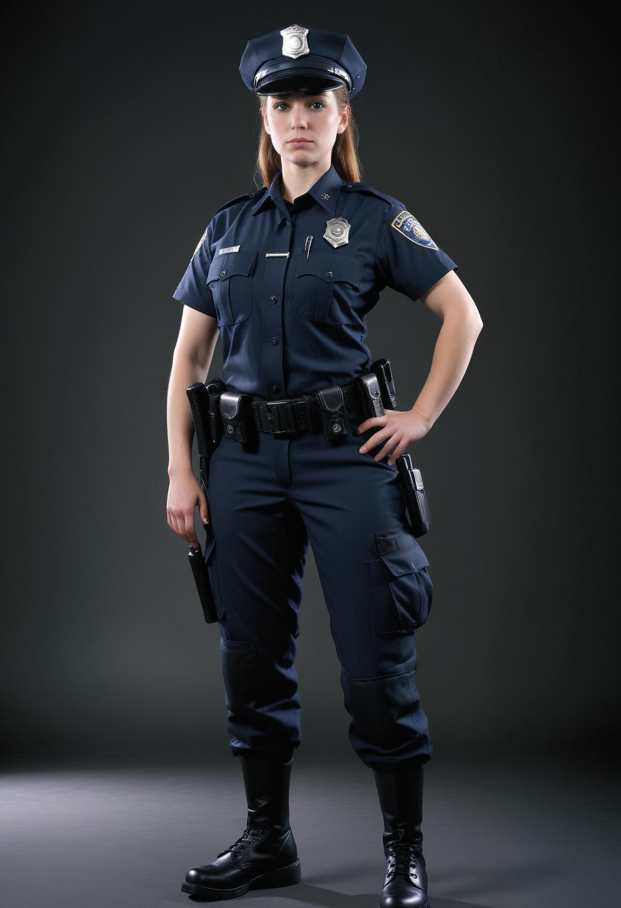 A female police officer in full uniform stands confidently, holding a gun in one hand and resting the other on her hip