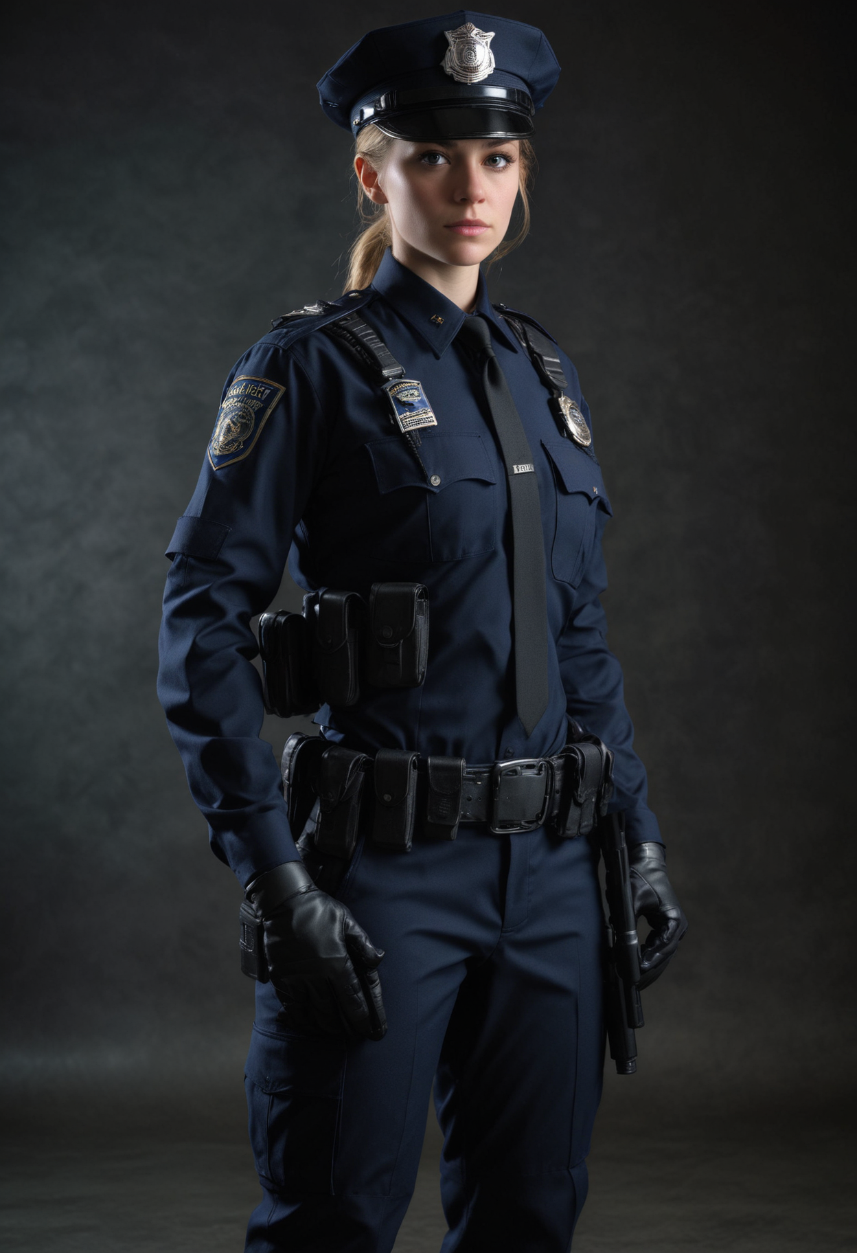 background, badge, belt, dark, duty, enforcement, female, gun, headshot, law, officer, order, police, portrait, professional, protection, security, serious, studio, uniform
