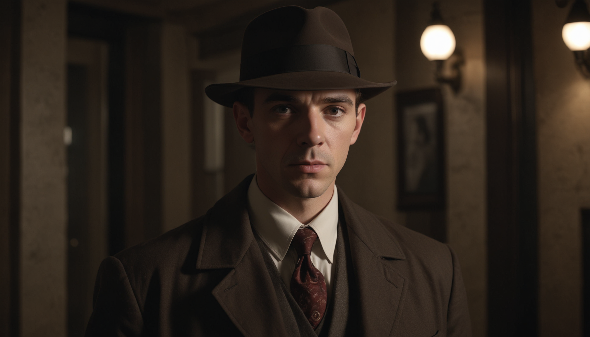 A man in a fedora and suit stands in a dimly lit room with a picture on the wall behind him.