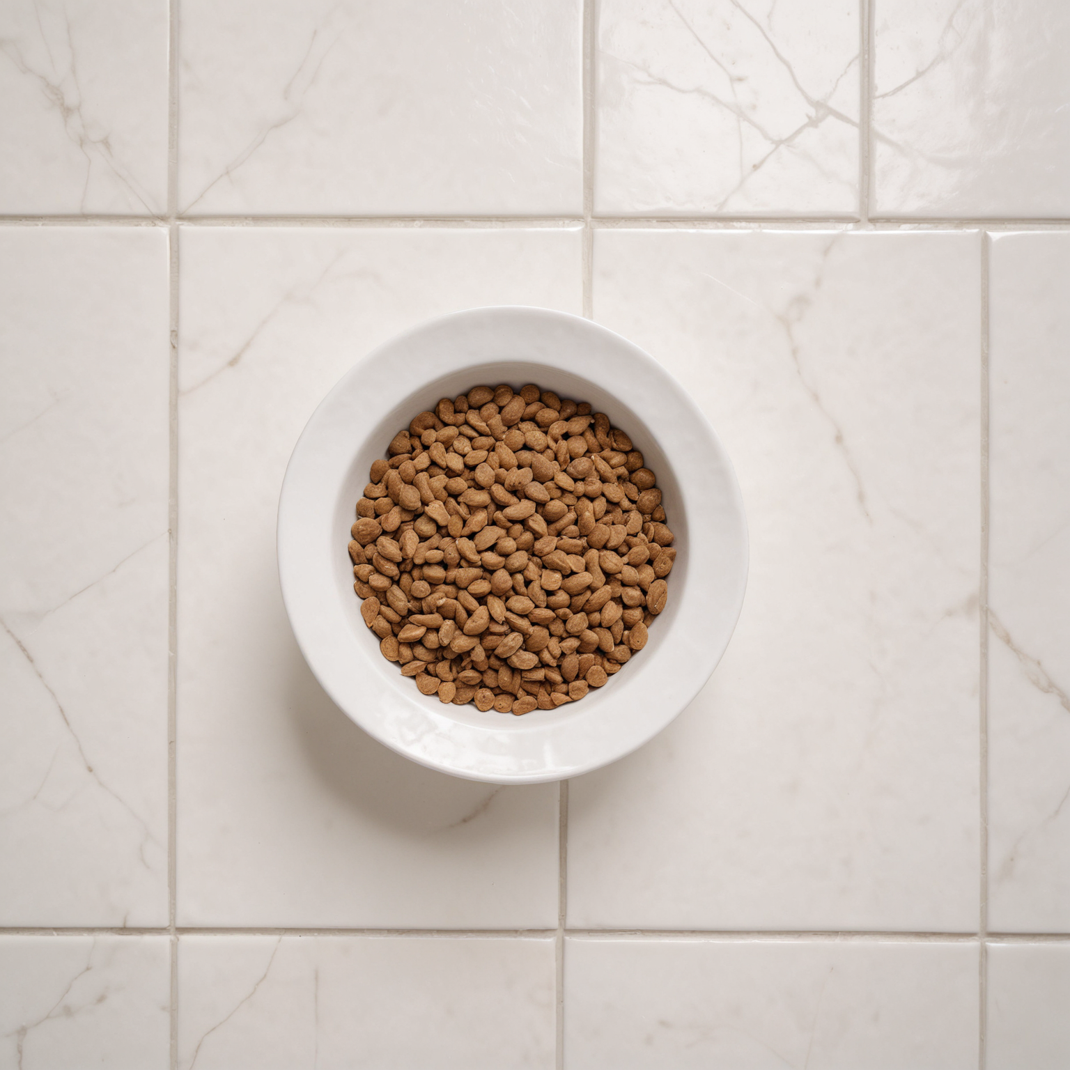animal, bowl, breakfast, brown, cat, dinner, dish, dog, feed, floor, food, kibble, kitchen, meal, mealtime, nutrition, pet, snack, tile, white