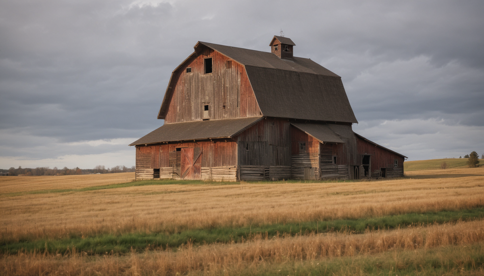 A weathered wooden barn stands in a field of tall grass. The sky is overcast with clouds.