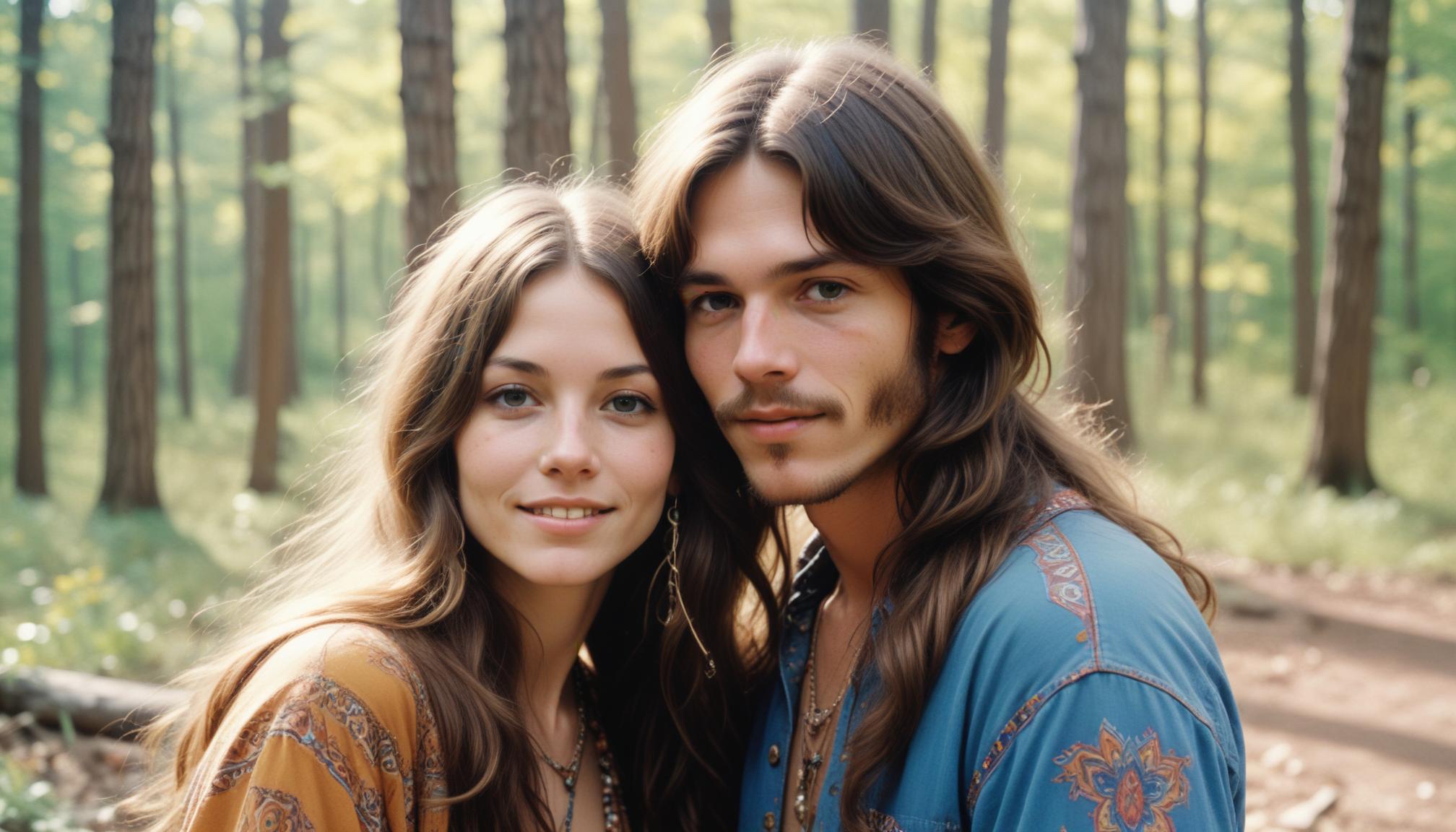 A young couple with long hair stands close together in a forest. She wears a patterned blouse; he wears a blue patterned shirt