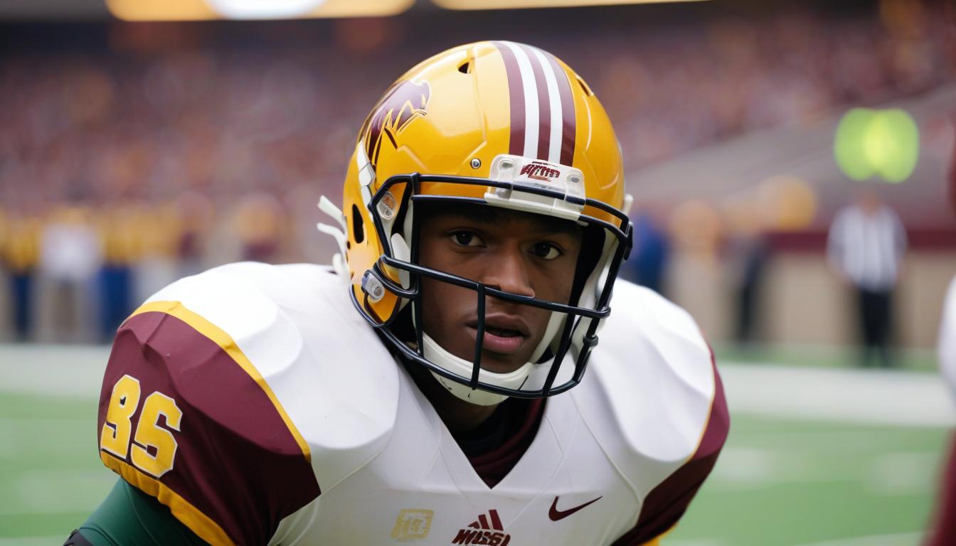 A young football player in a white and maroon uniform looks directly at the camera. He is wearing a yellow helmet with a maroon stripe.