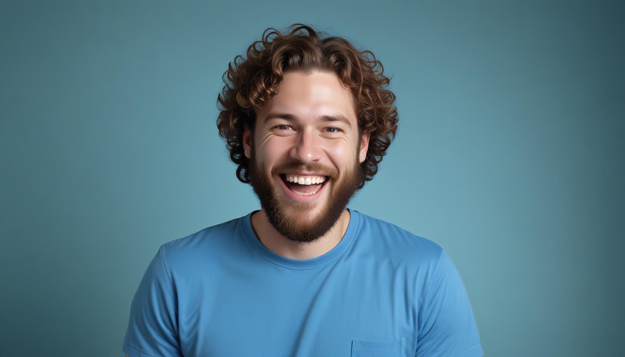 background, beard, blue, cheerful, curly, emotion, expression, hair, happy, joy, laughing, man, model, person, portrait, positive, shirt, smile, studio, t-shirt