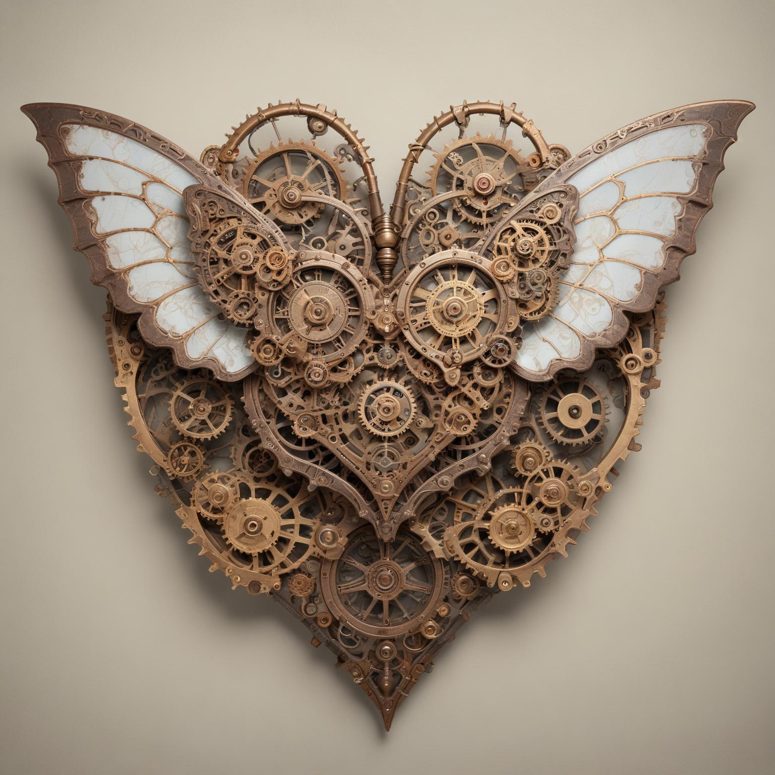A heart-shaped sculpture composed of intricate gears and cogs, with delicate, white butterfly wings.