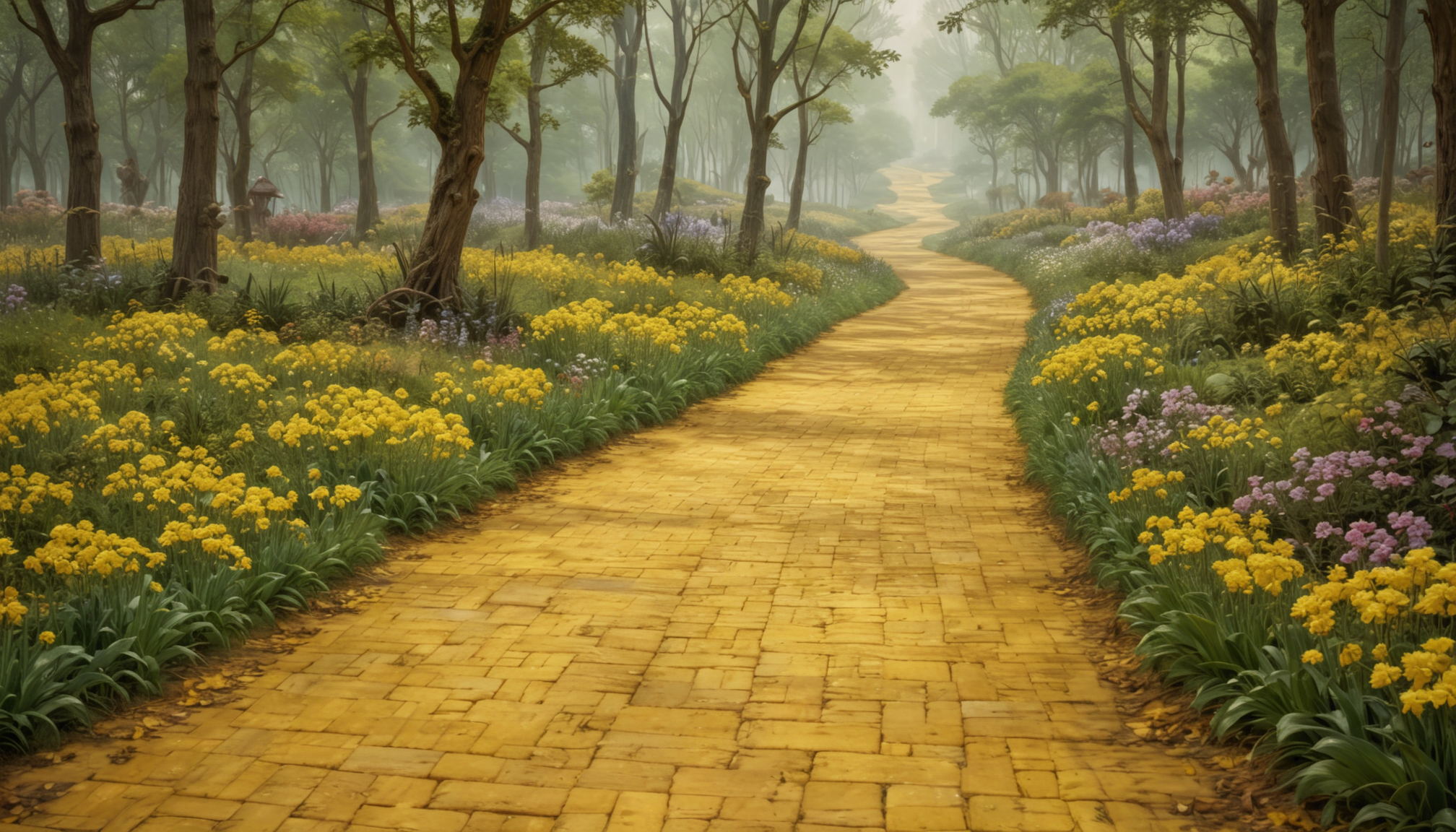 A winding yellow brick road leads through a foggy forest, lined with yellow flowers.