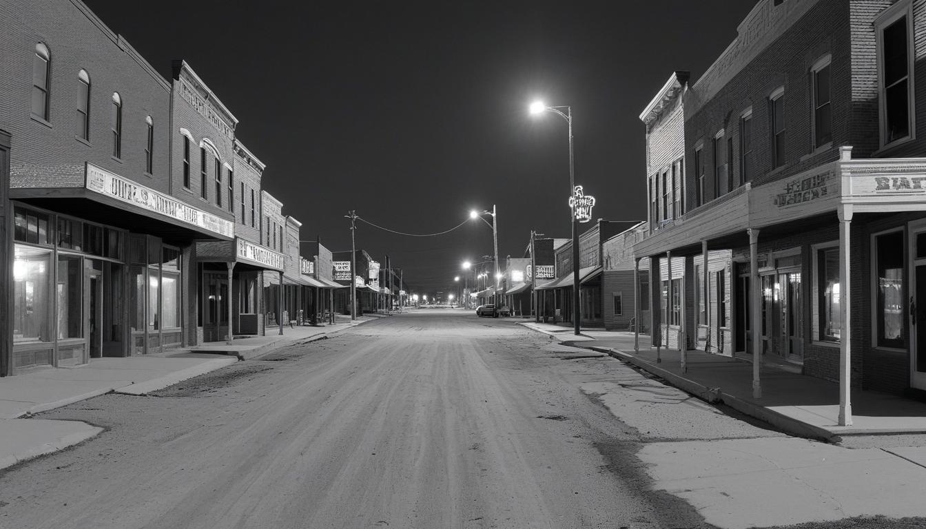 A deserted street lined with old-fashioned buildings in a small town at night. Streetlights illuminate the empty street and the storefronts.