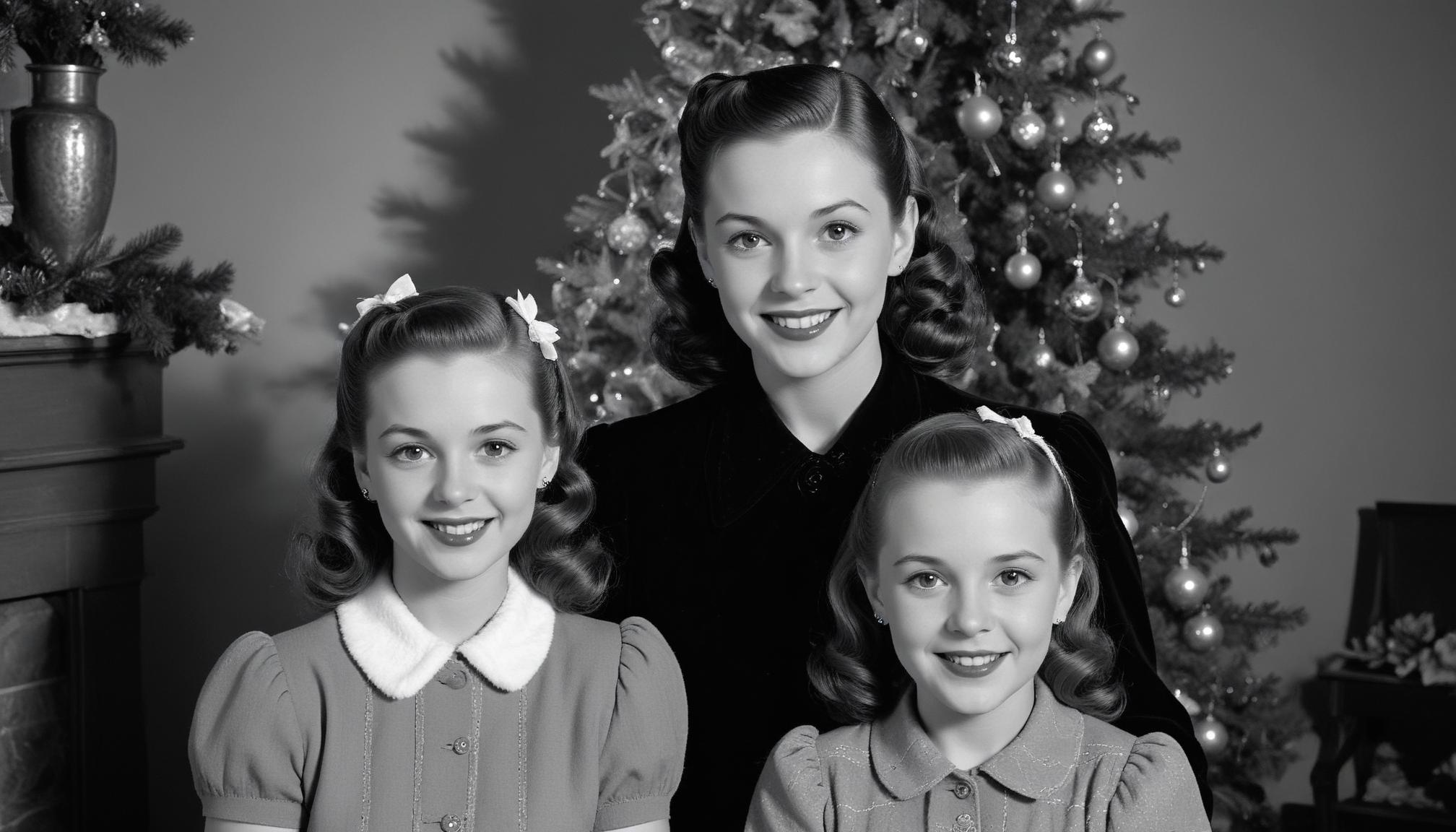 1940s, cheerful, christmas, decorated, family, festive, girls, happy, holiday, indoor, lights, ornaments, portrait, pose, retro, season, smiling, tree, vintage, women