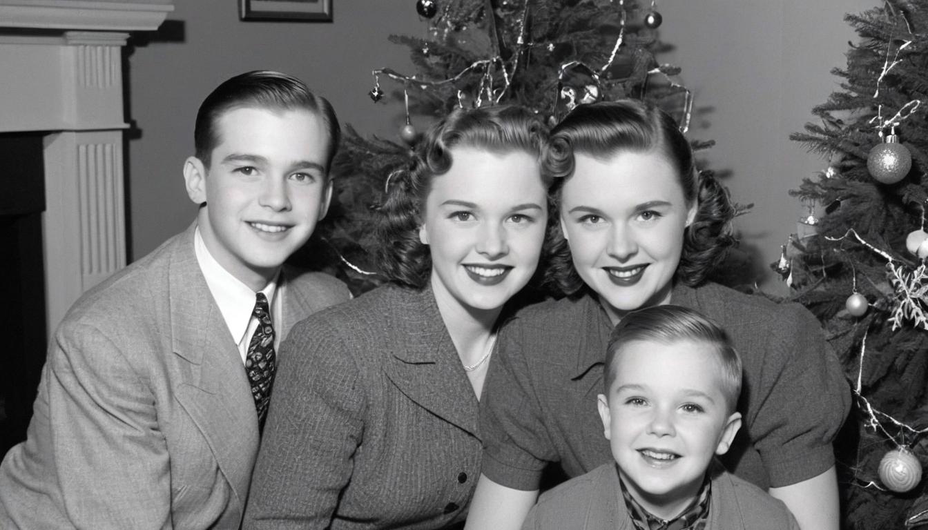 1940s, brother, celebration, christmas, decorations, family, festive, happy, holiday, joy, love, ornaments, portrait, season, sister, smile, together, tradition, tree, winter