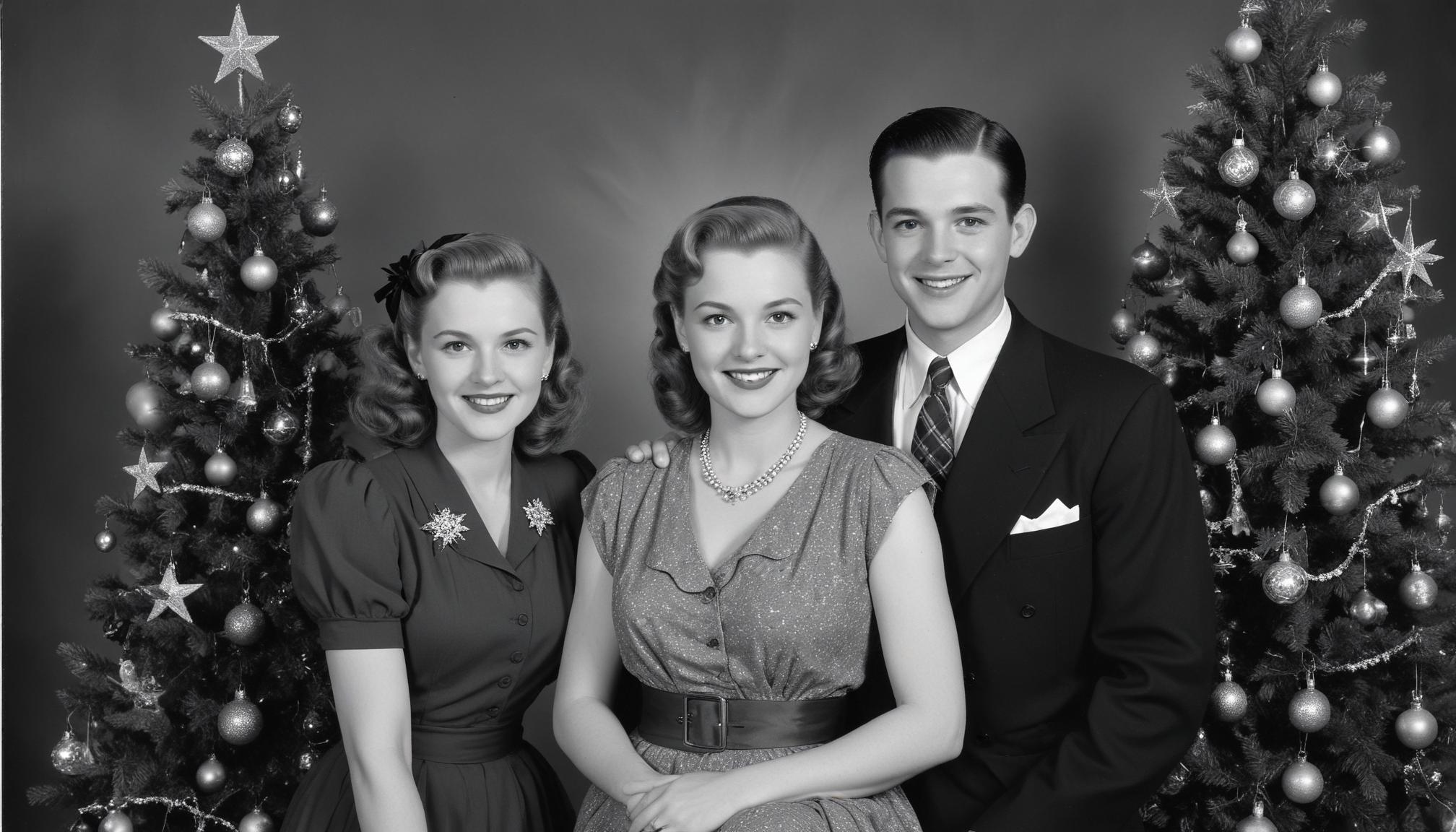 1940s, 1950s, cheerful, christmas, couple, decorated, festive, friend, happy, holiday, ornaments, people, portrait, pose, retro, season, smile, tree, vintage, woman