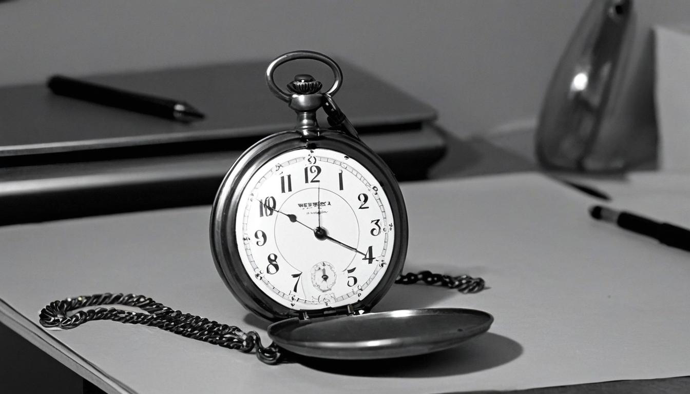A silver pocket watch with a chain lies open on a desk. A pen and a book lie on the desk behind the watch.