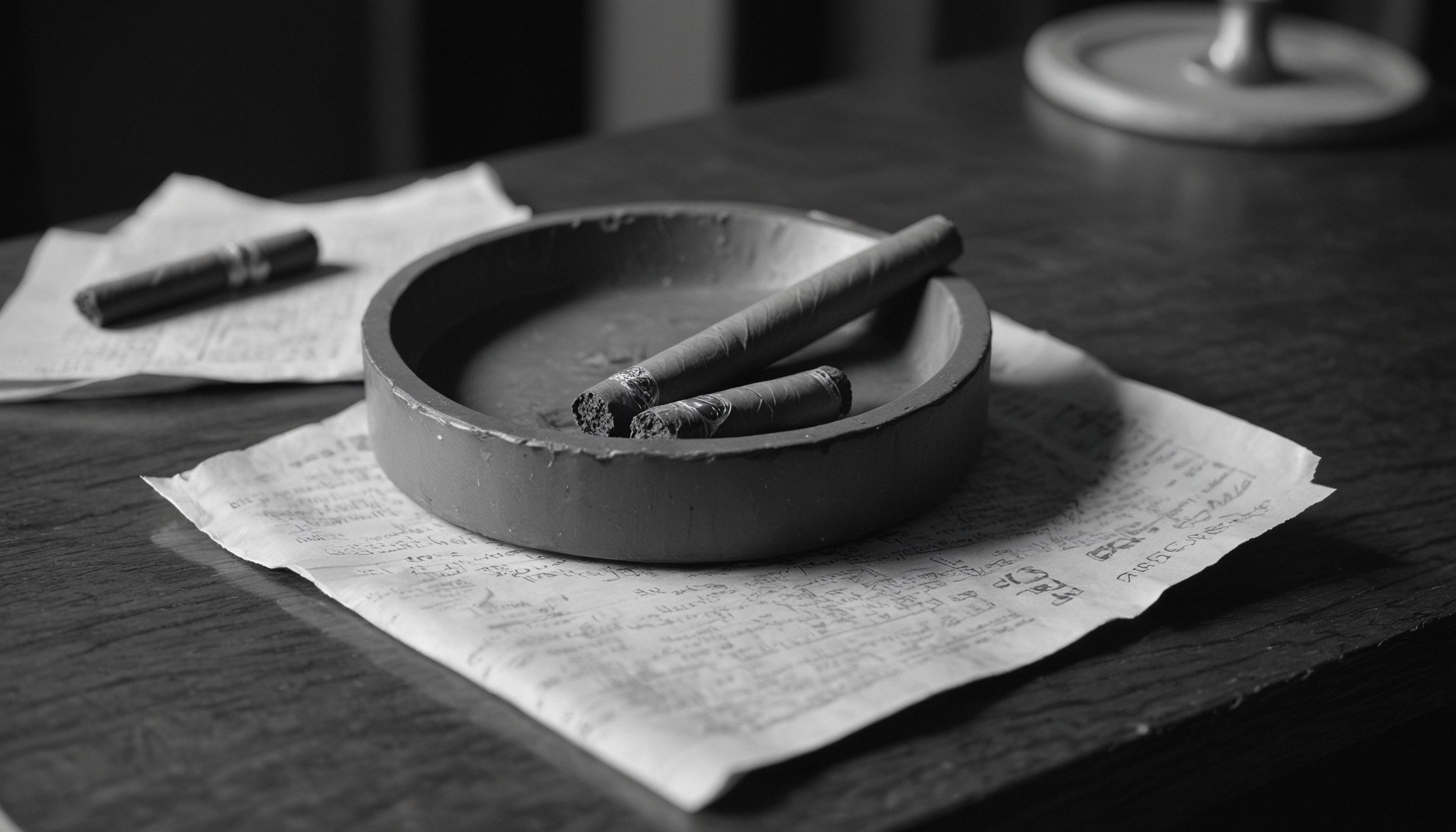 ash, ashtray, brown, cigar, close, dark, detail, indoors, life, monochrome, newspaper, paper, round, smoke, still, surface, table, texture, tobacco, wood