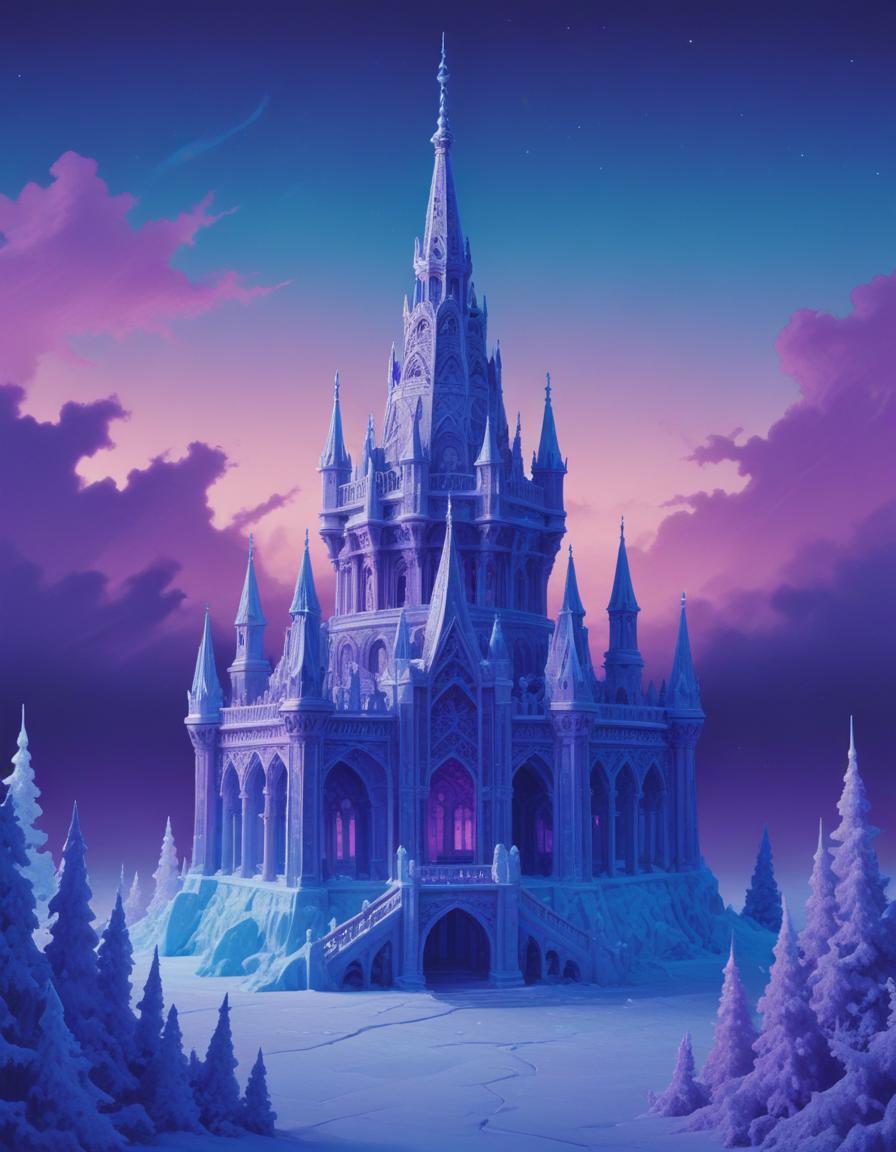 architecture, castle, cold, detail, doors, fairytale, frozen, ice, landscape, majestic, night, ornate, purple, sky, snow, spire, tower, twilight, windows, winter