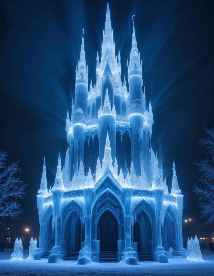 A towering ice castle, glowing with blue lights, stands in the middle of a snowy field under a dark sky.