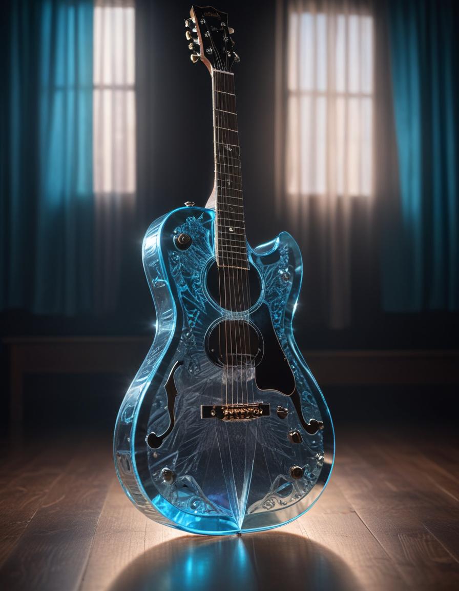 acoustic, blue, detail, dim, floor, guitar, harmony, instrument, intricate, light, melody, music, musical, play, rhythm, room, sound, string, transparent, wood
