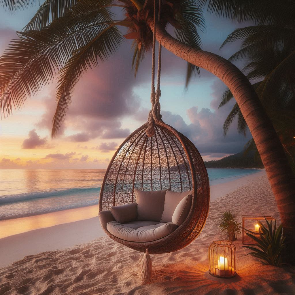 A wicker swing hangs from a palm tree on a white sand beach, with the ocean and sunset visible in the background.