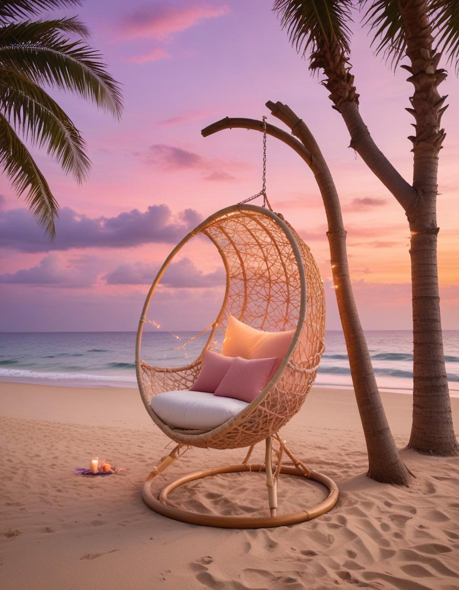 A hanging chair with pillows sits on a sandy beach at sunset.