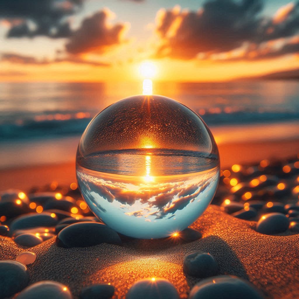 A crystal ball sits on a sandy beach, reflecting a vibrant sunset over the ocean.