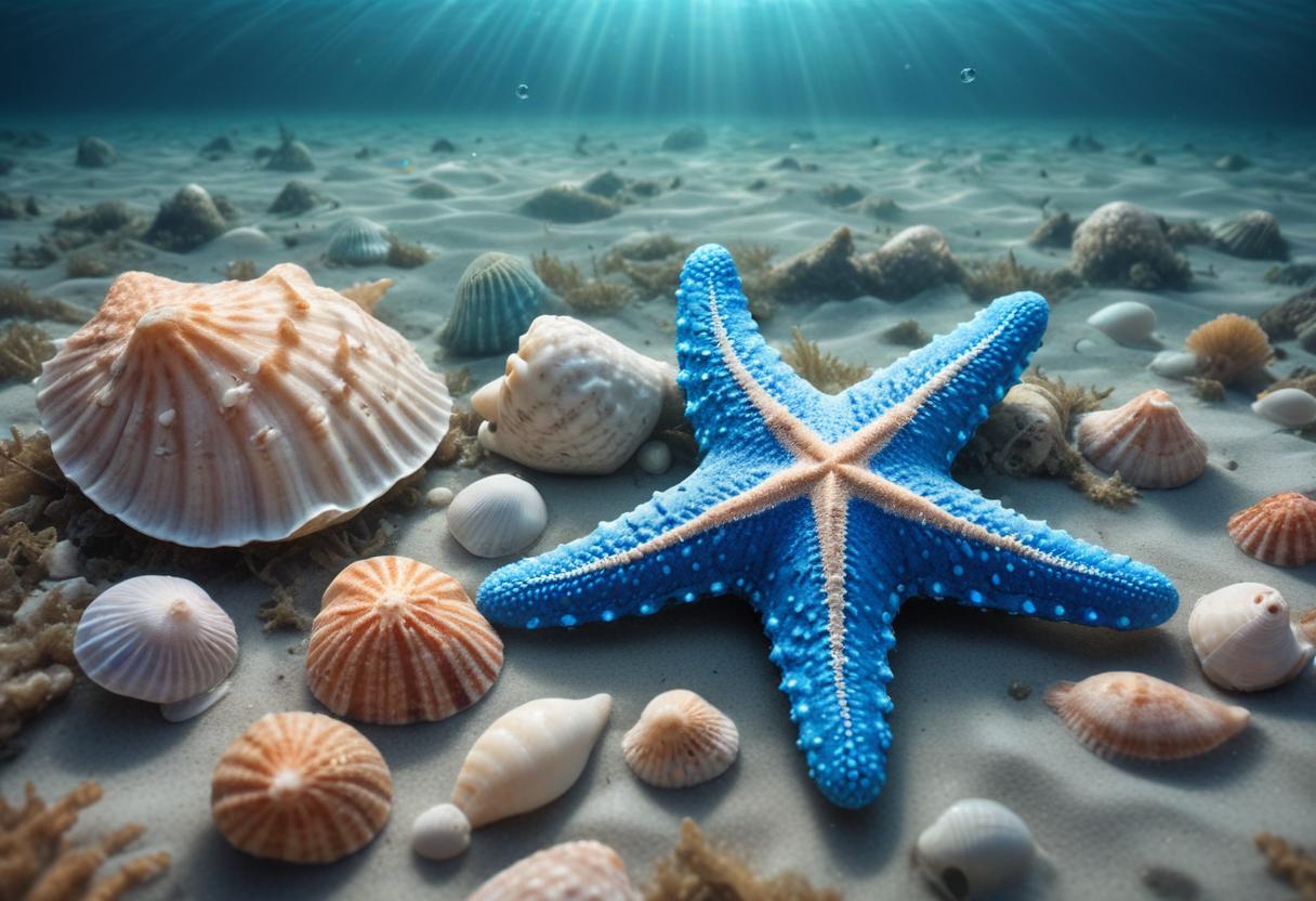 A blue starfish rests on a sandy seabed, surrounded by seashells and coral.