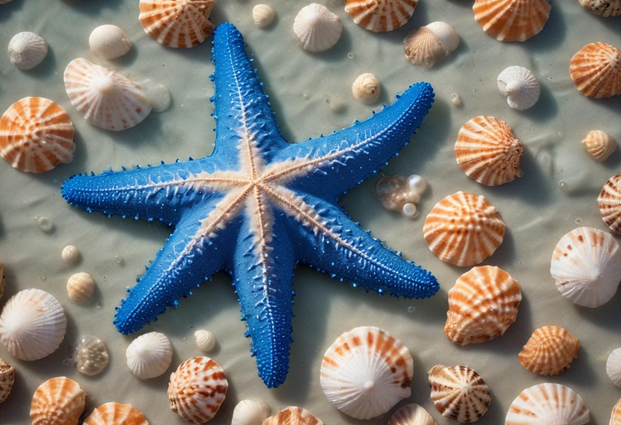 A blue starfish sits on a bed of seashells, its bright color standing out against the white and orange shells.