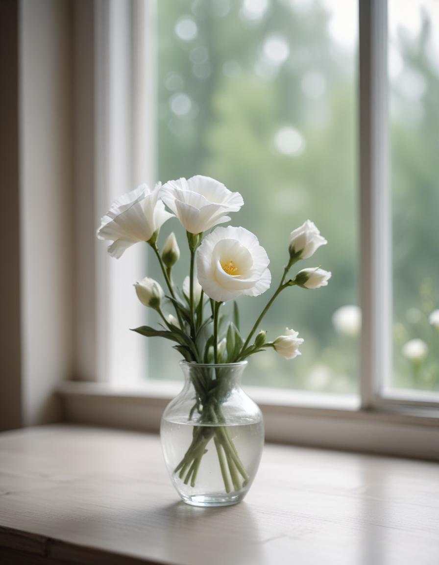 arrangement, bloom, blossoms, clear, floral, flowers, glass, green, indoor, leaves, life, light, minimal, natural, sill, simple, still, vase, white, window