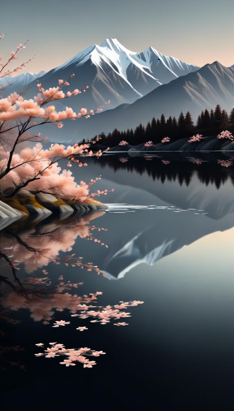 A serene lake with a snow-capped mountain in the background. A cherry tree in bloom stands on the shore, its reflection mirrored in the calm water.
