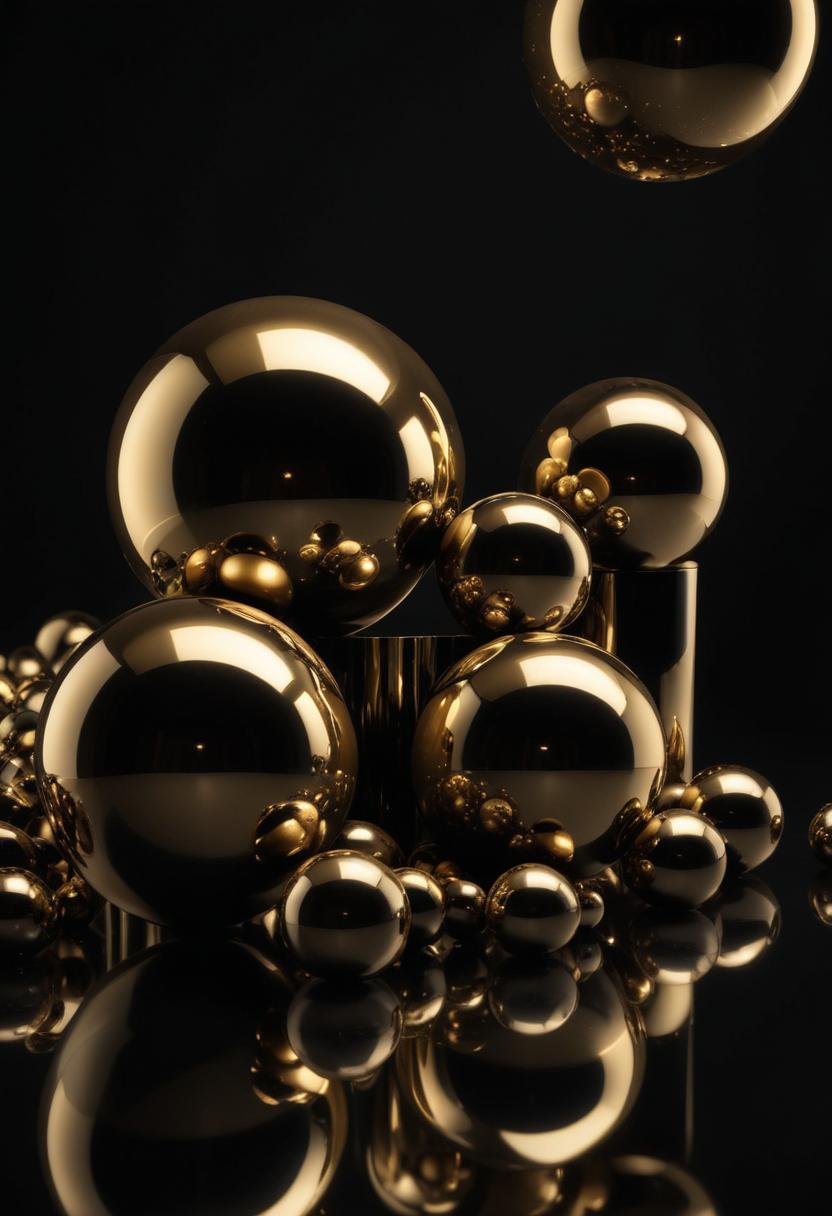 abstract, art, background, ball, black, design, geometric, gold, life, light, metallic, object, reflection, round, shape, shiny, spheres, still, surface, texture