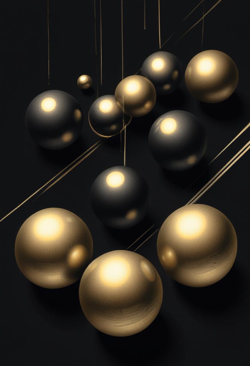 Golden and black spheres hang from thin strings against a dark background, lit by an unseen light source.