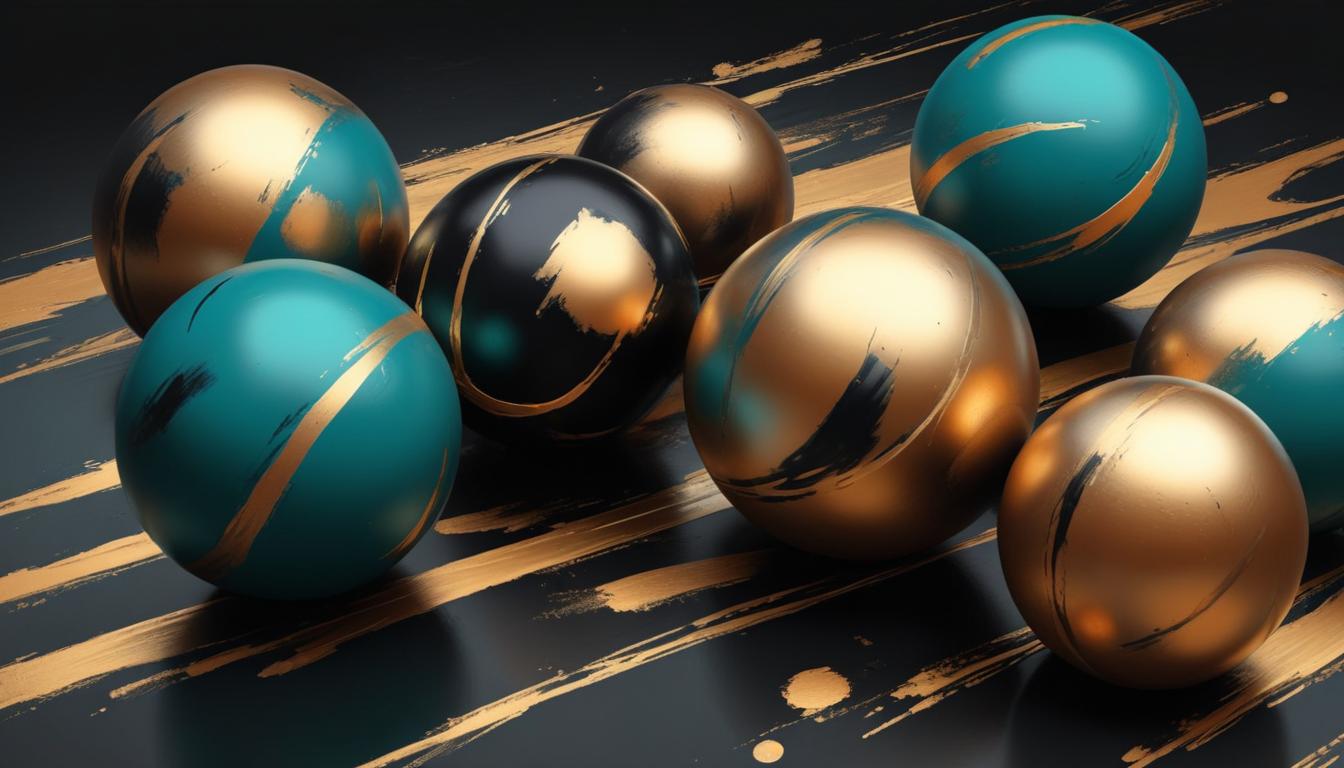 Golden and teal spheres with black brushstrokes sit on a black surface.
