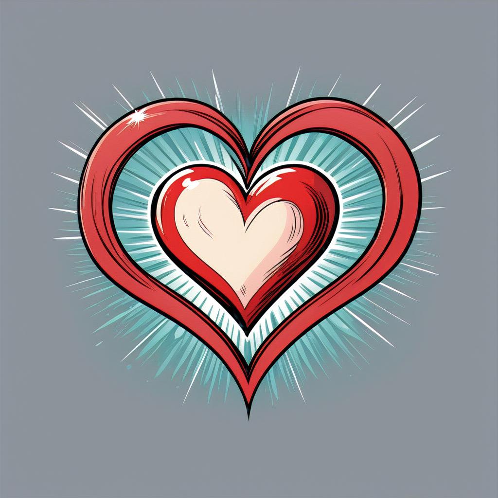 Illustration of a red double heart with a light center on a teal background, featuring a light burst effect around it
