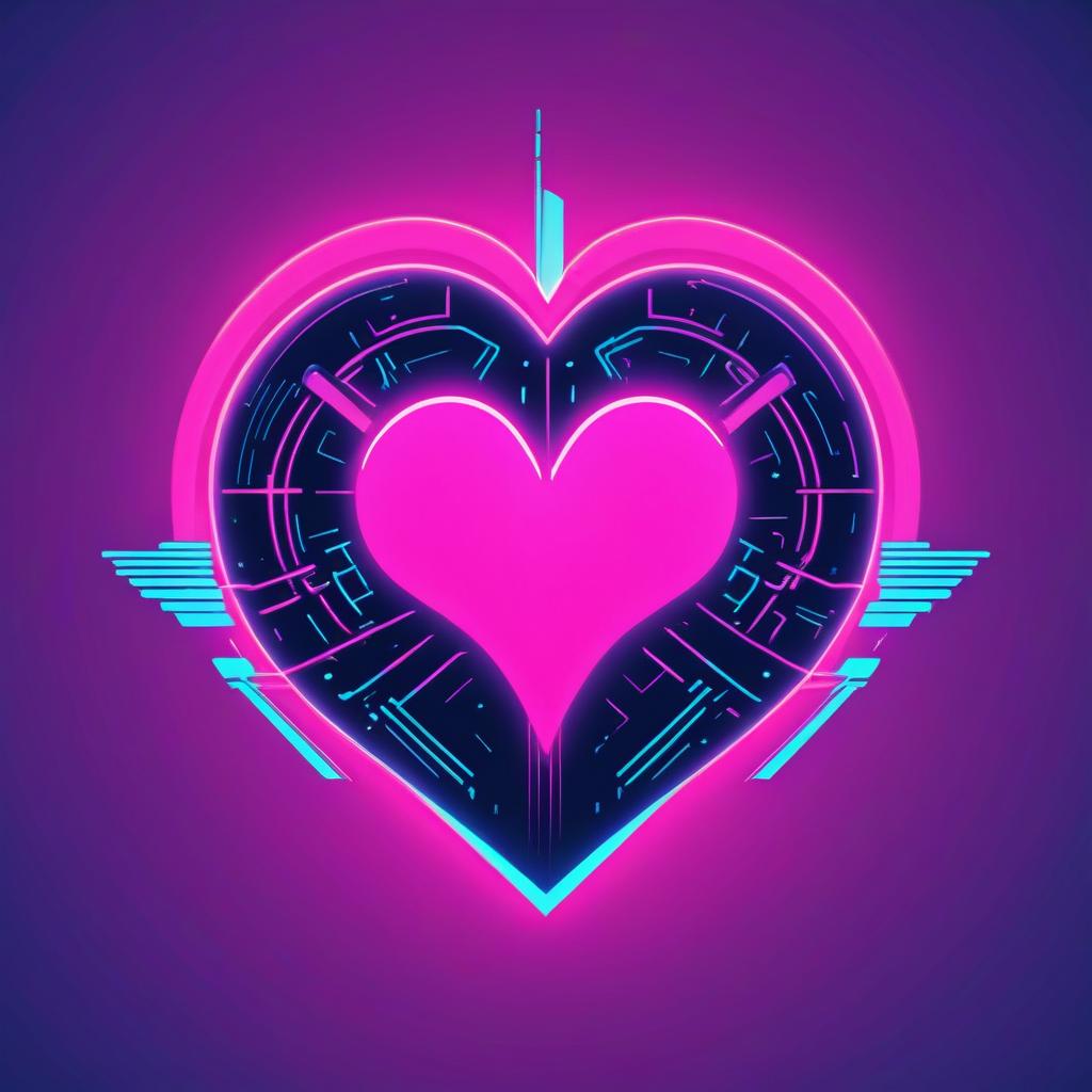 A glowing pink heart with blue circuitry and neon accents against a purple background.