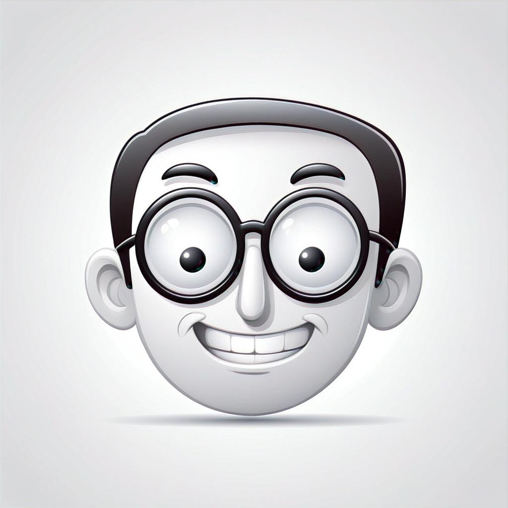 A cartoon man wearing glasses smiles with his eyes wide open.