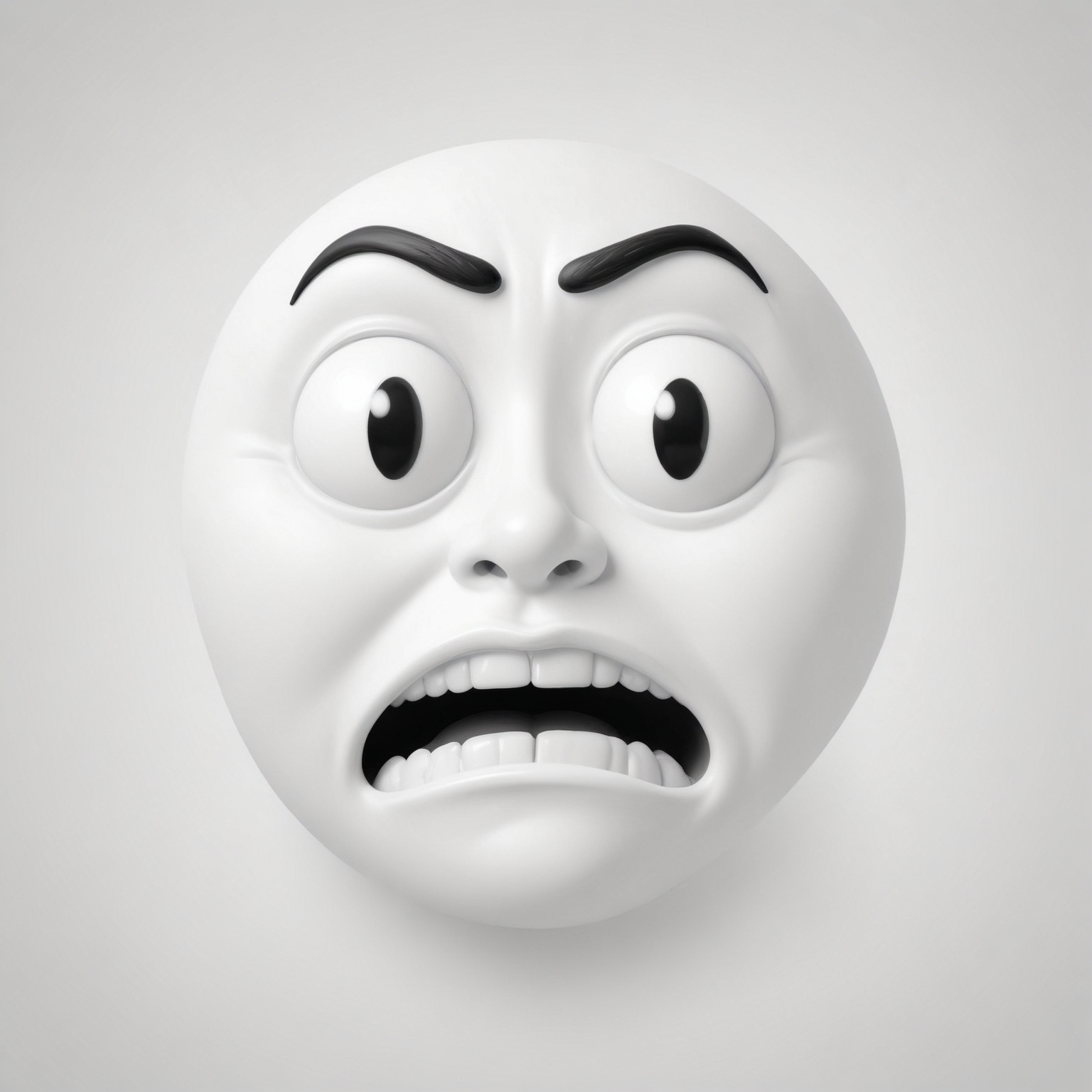 A white 3D face with a scared expression, wide eyes, and an open mouth.