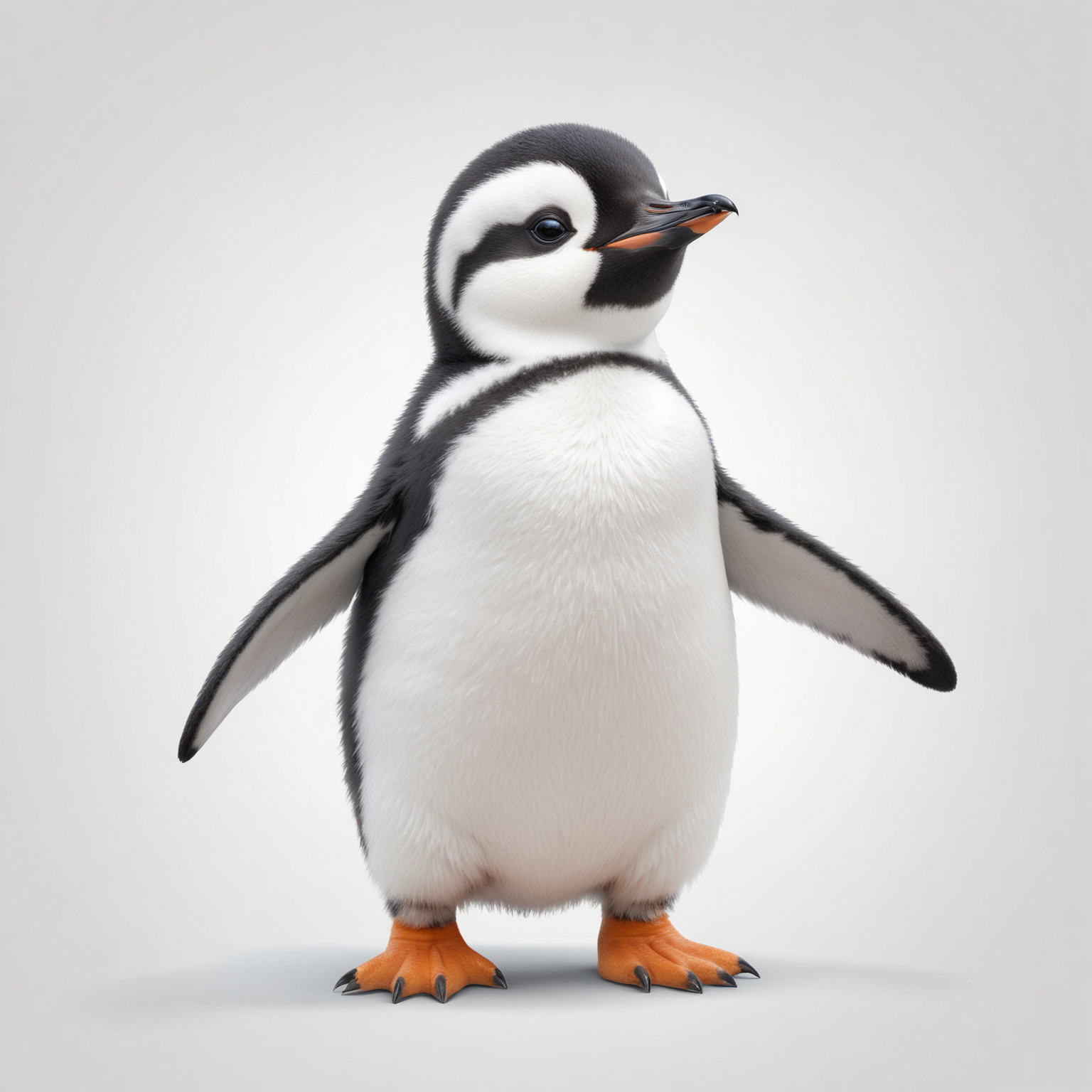 A young penguin stands with its wings outspread against a plain white background.