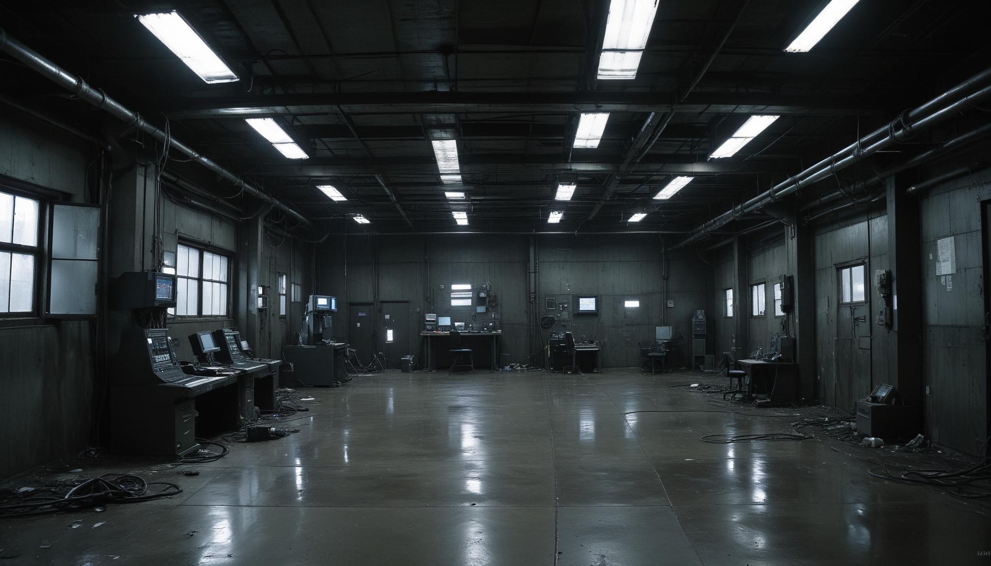 abandoned, building, concrete, dark, empty, equipment, factory, floor, fluorescent, grey, industrial, interior, lights, metal, pipes, shadows, space, warehouse, windows, workspace