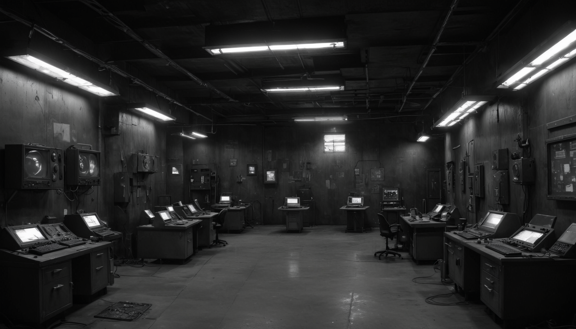 abandoned, ceiling, chair, computer, dark, desk, dim, dusty, empty, keyboard, light, monitor, mouse, network, room, screen, server, technology, underground, workstation