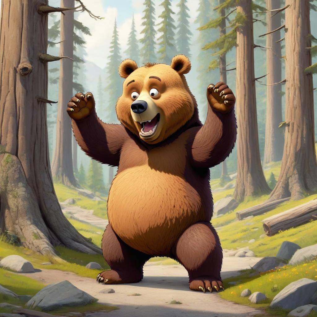 animal, animated, bear, brown, cartoon, character, daytime, excited, forest, happy, illustration, nature, outdoors, path, smiling, standing, summer, trees, wildlife, woods