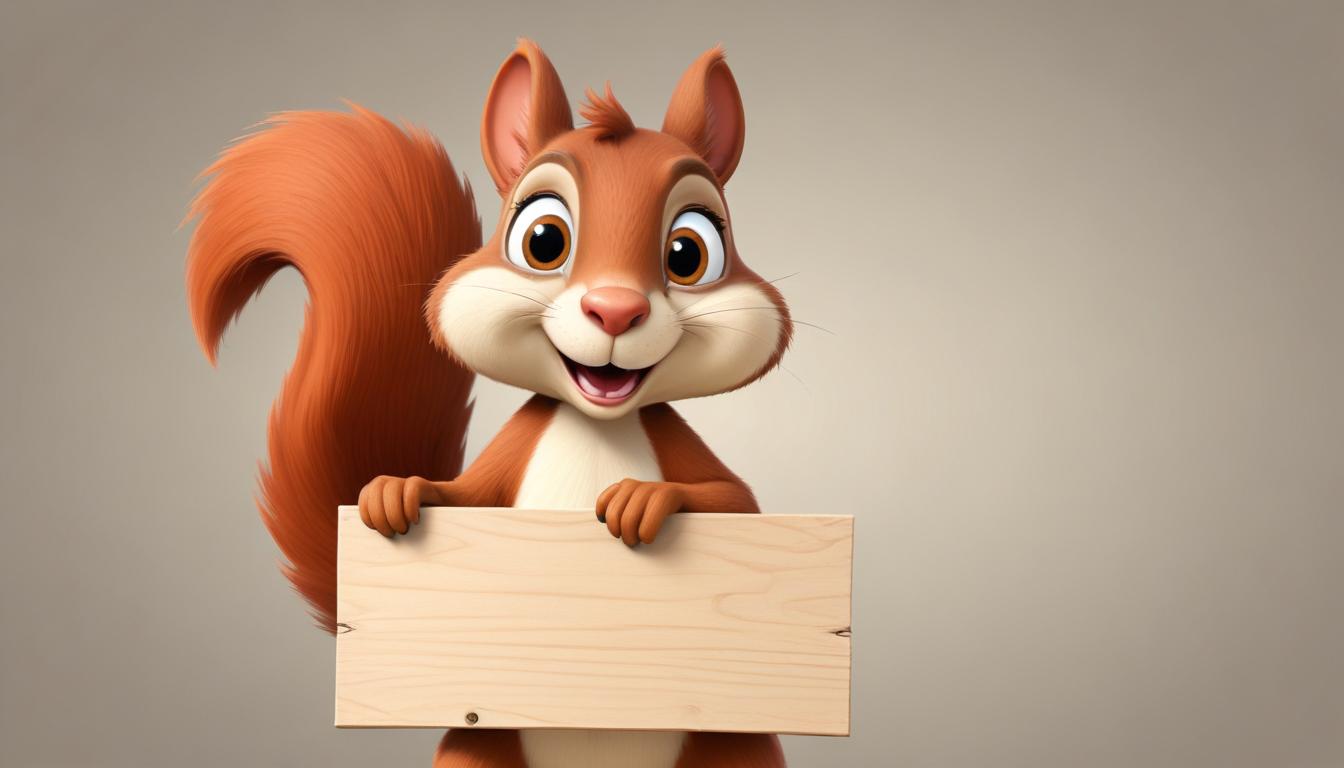 A cartoon squirrel with a bushy tail holds a blank wooden sign. The squirrel has a big smile and looks directly at the camera.