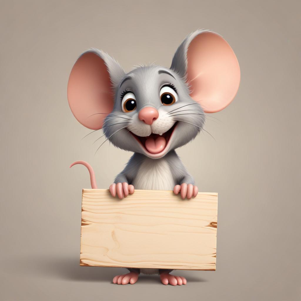 A cartoon mouse smiles as it holds a blank wooden sign.