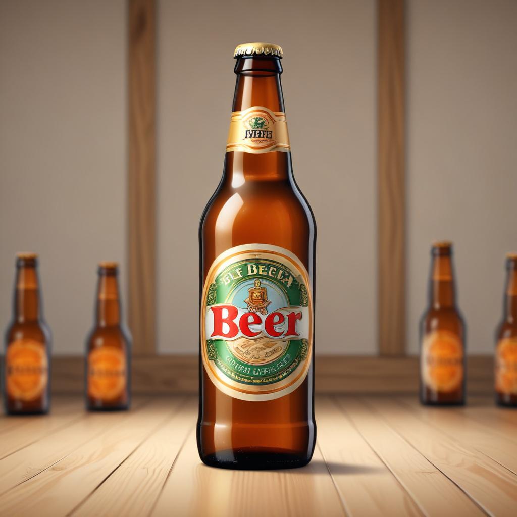 A beer bottle with a green label stands on a wooden surface, with other bottles blurred in the background.