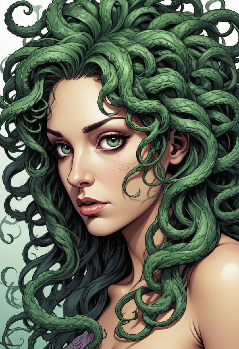 A close-up portrait of Medusa, the Greek mythological figure with a head of snakes. Her eyes are green, and her expression is intense.