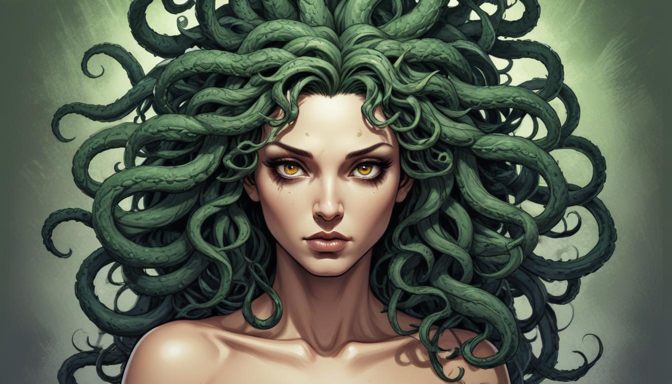 A digital illustration of Medusa, a mythical figure with a head of snakes, staring directly at the viewer.