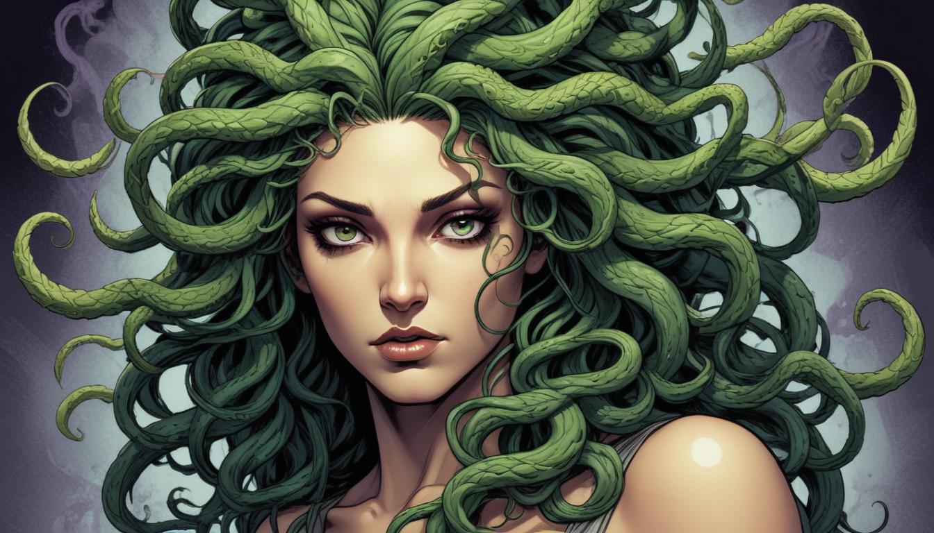 A close-up portrait of Medusa, a mythical Greek figure with snakes for hair.