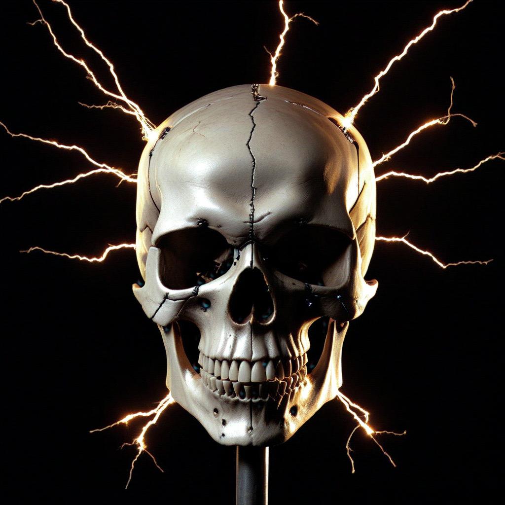 A human skull is surrounded by bright, glowing lightning bolts, suggesting the power and intensity of death.