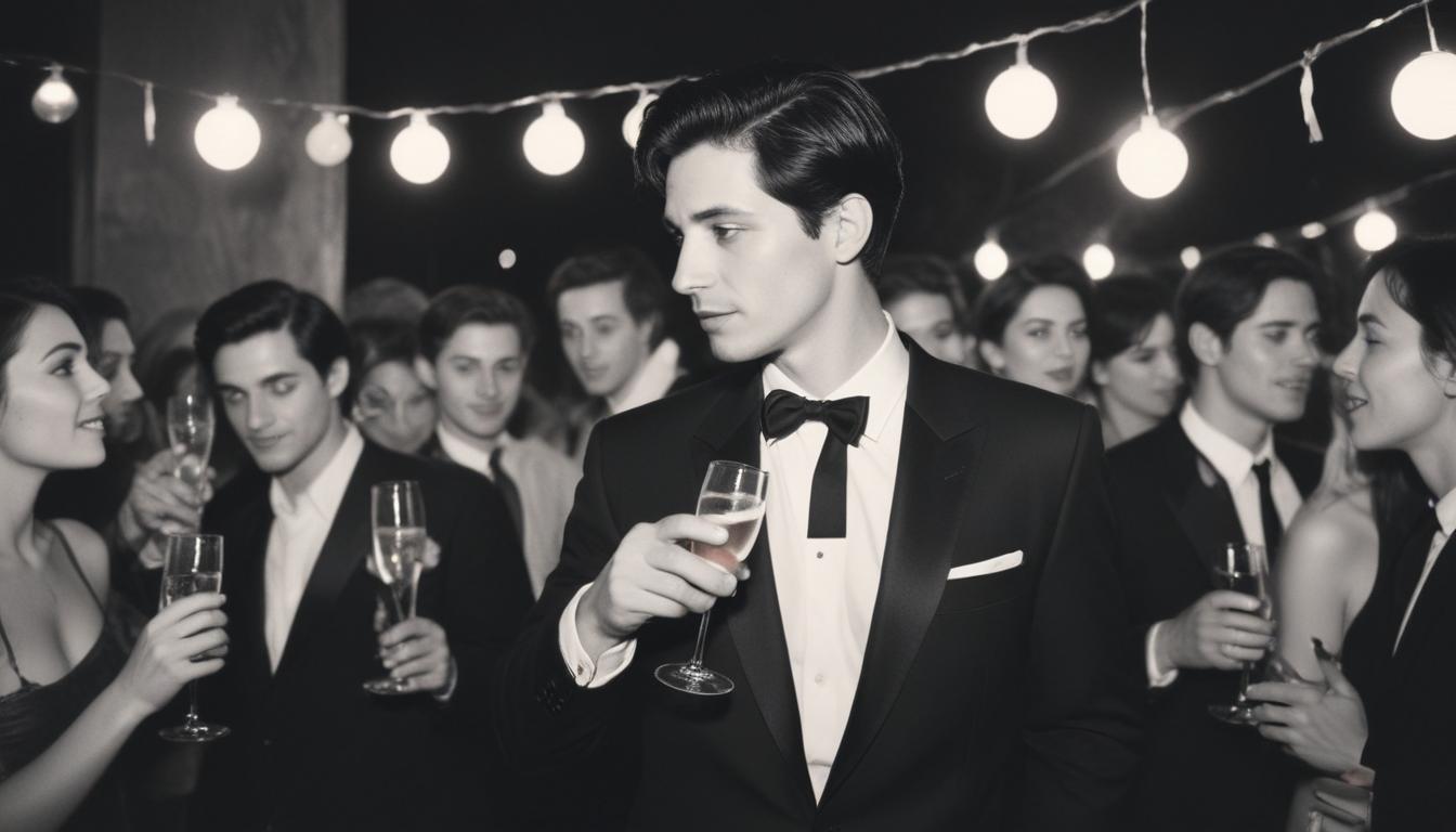 A man in a tuxedo holds a glass of champagne and looks over at a woman while talking to another guest at a party. String lights are strung overhead.