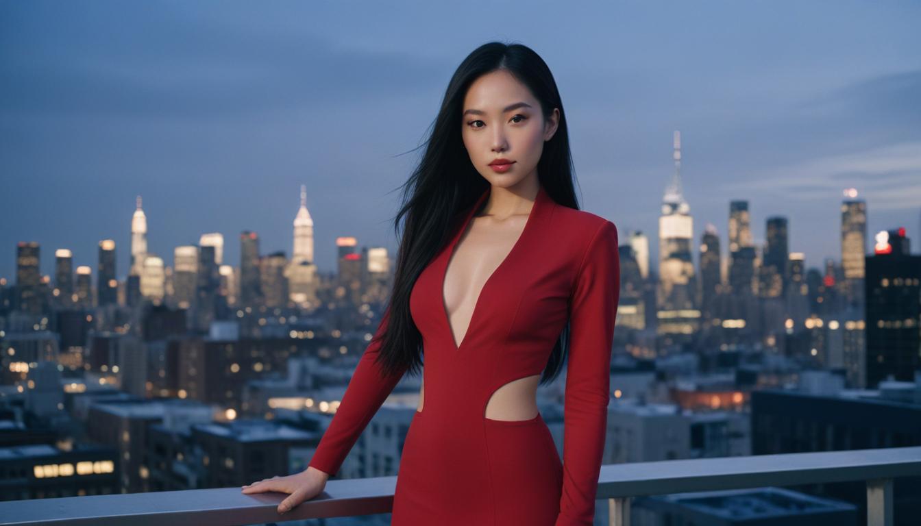 A woman in a red dress stands on a rooftop overlooking a cityscape at dusk.