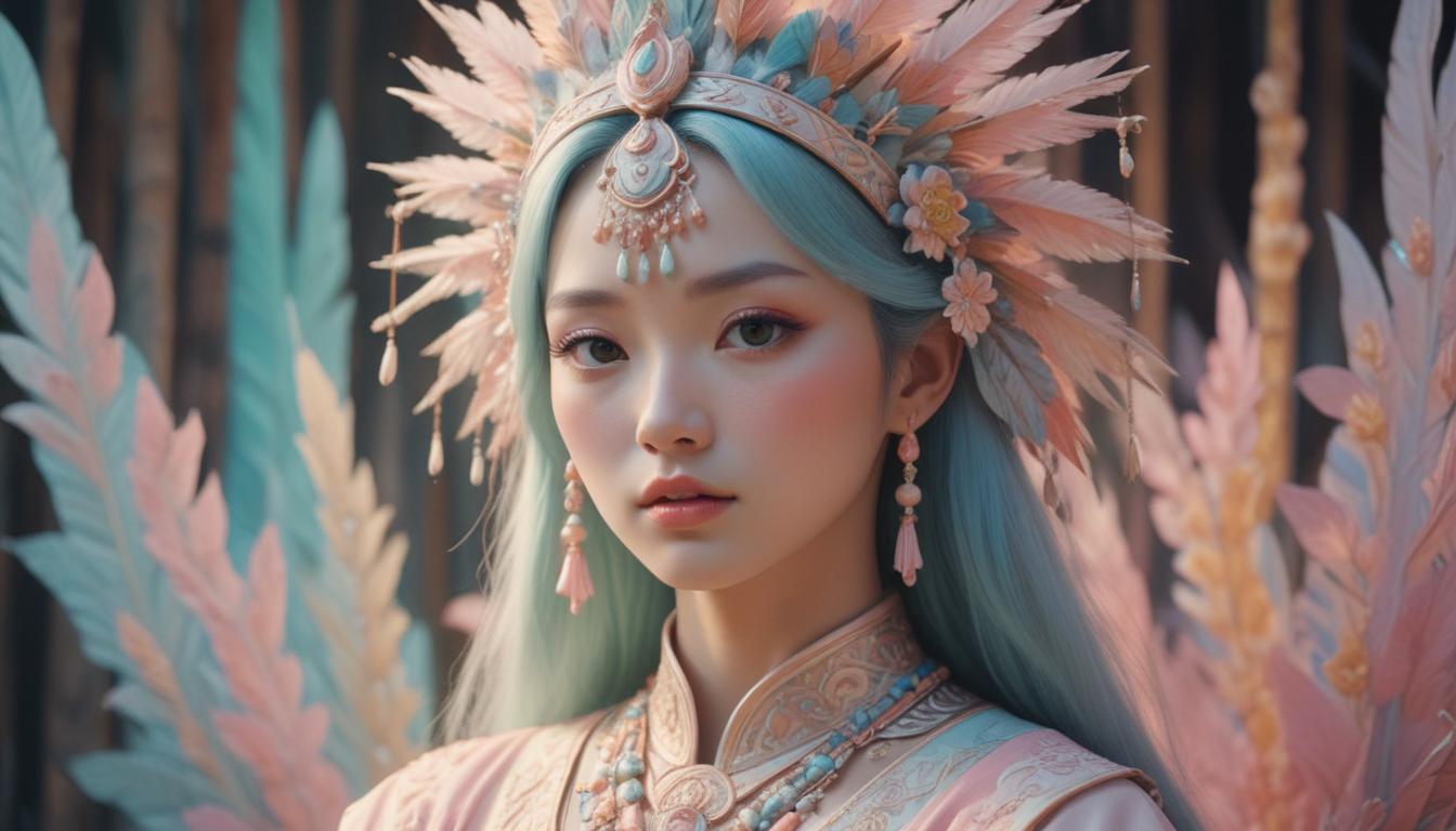 A woman with blue hair and a feather headdress looks directly at the camera. She is wearing a pink and white dress with intricate details.