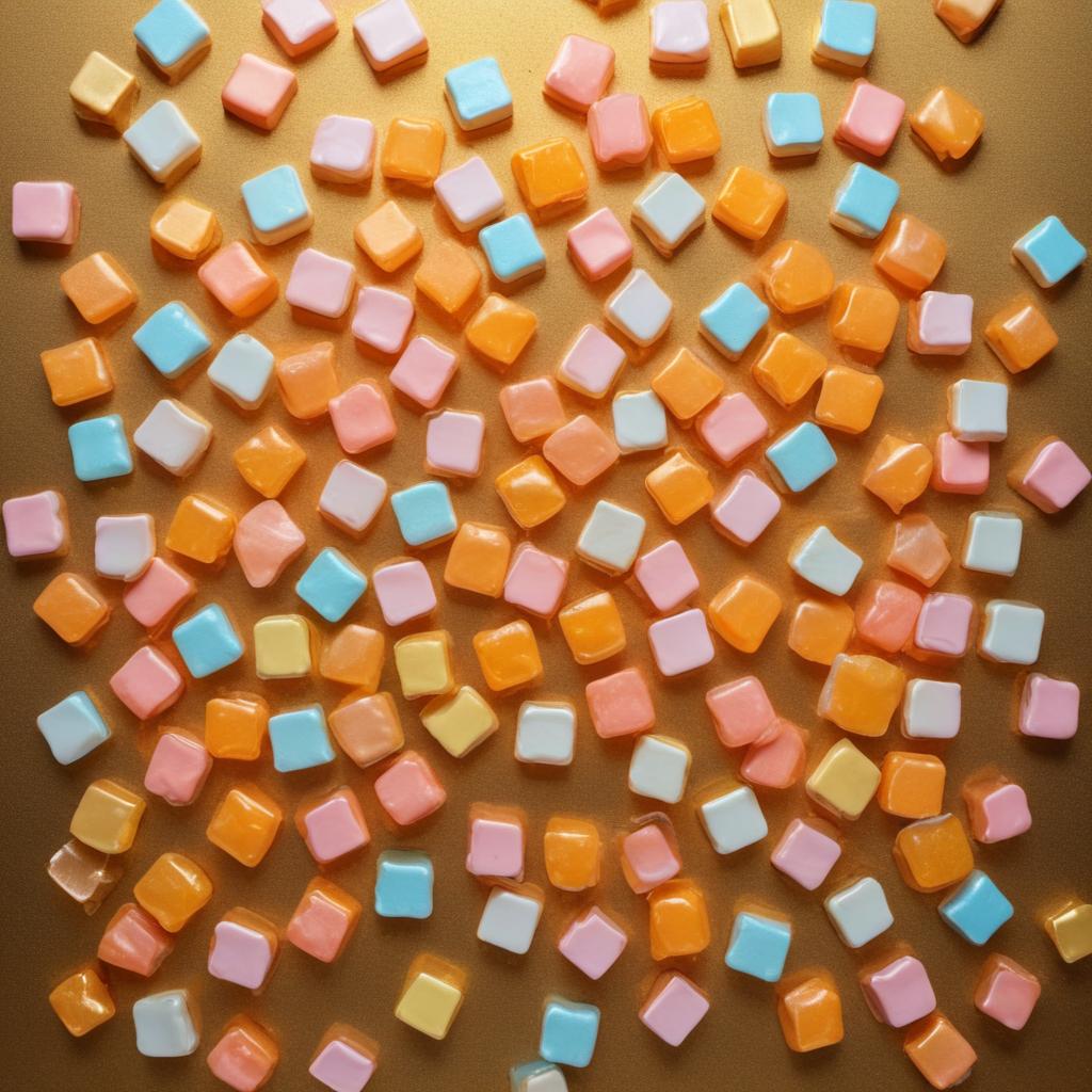 A close-up image of numerous small, colorful square tiles arranged in a scattered pattern on a golden surface.